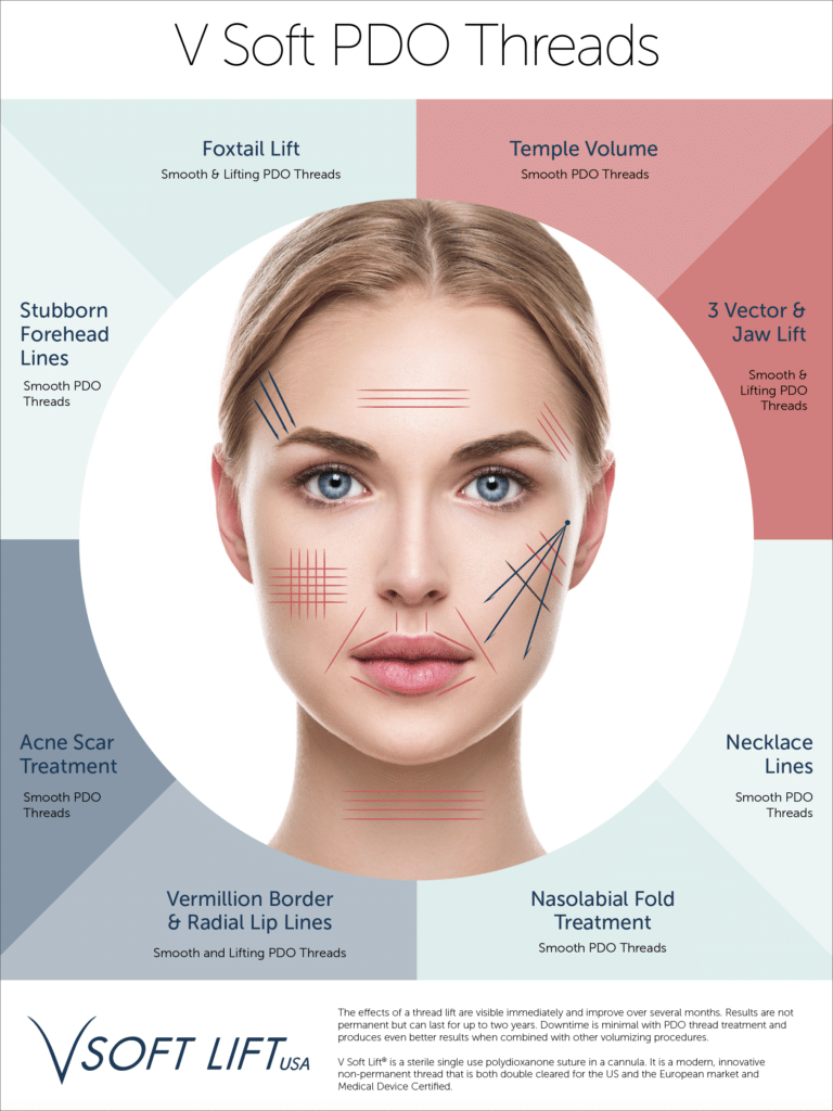 This professional poster highlights key facial areas treatable with V Soft Lift PDO threads, making it a perfect visual guide for your clinic or practice.